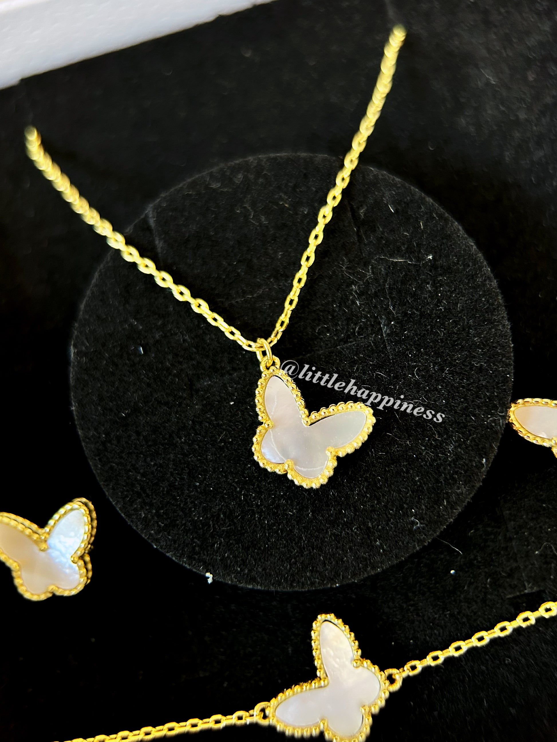 Conjunto Collar + aretes + pulsera Mariposa Van Cleef Dorado y Blanco